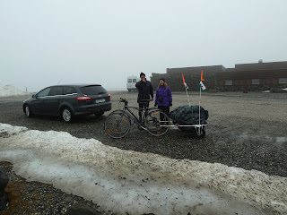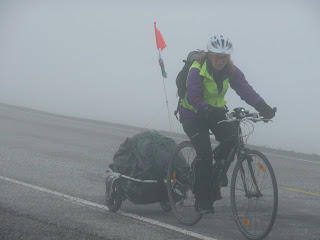 This was the day all our support ,both psychological and practical was to desert us. Dean and Ann were off on their luxury holiday with our car while we convinced ourselves that we would much rather put up with aching bodies, sore bums and exhausted lungs. Hauling 25 plus kilos of extra weight just added to the excitement of it all. However we all thought we would like to see Nordkapp so despite the all encompassing fog, which we were sure would lift (wrong) we all piled in the car for the last time and set off. At the entrance the shock of discovering that the 247 NEK (about £24 ) was to be multiplied by four nearly made us abandon the enterprise. AND the centre would not open until 11 and it was only 9.48. As we could see nothing anyway it seemed a good idea to take off our long suffering bikes, load trailers and see if I could remember how to ride. A quick whizz round the car park ensured that I could mount, ride and dismount without disaster – one step nearer this mad venture. At 11 Dean took out a mortgage and bought us all a parting hot chocolate. A wander round viewing war time manoeuvres, dead sea birds on a cliff, and a trophy room pertaining to a king of Thailand who had apparently visited Nordkapp, we ventured into the souvenir shop and bought postcards purporting to show the views from Nordkapp which we were unable to verify as visibility was rarely more than 50 metres. Departure now loomed large. Hugs all round and we disappeared into the mist and mizzle. For almost the entire ride we saw only the immediate roadside which may have been a blessing in disguise as we had no idea how awful the ascents would be. Little imagination was required: legs and lungs told the story very eloquently. Tomorrow will tell another story or maybe just the same one.