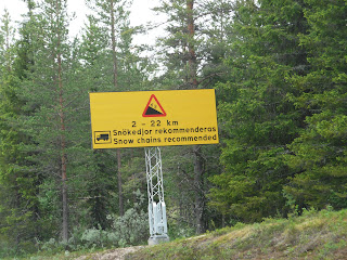 I know that weather men get a bad press and today they thoroughly deserved it. When did warm and sunny manifest itself as overcast, and cold? We should have ignored the met men and clad ourselves in winter woollies. We still felt sure that temperatures would rise from this lowly 11 degress. So, we kept to shorts but added an extra body layer. As we prepared to quit the campsite, we were hailed with a cheery, “Hey, is that a Welsh flag?” We were so surprised we almost forget to unclip SPDs. No one, since leaving Nordkapp, had even heard of Wales, much less recognised the flag. Our new friend was an exuberant and enthusiastic Dutch cyclist who, with her father was riding from Bodo to Nordkapp with mother in tow. After an exchange of stories we wished each other well and we pedalled on. Within 20 minutes of our leaving, an ominous rumble could be heard in the nearby (very nearby) hills. By the time we registered thunderstorm alert and rummaged for our waterproofs, nature had done her bit and we were just a tad wet. And then it got even colder! We were now carrying enough liquid to rehydrate an army in the prevailing conditions, as we had ensured that we would not experience a repetition of yesterday’s begging exercise. Still, good for the muscles, pulling all that extra weight and we had finished and dispensed with the empty Scotch bottle! Did I mention that it was cold?! Now, as I have pointed out before, some apparently not good things do have an upside. Today’s upside was a wind (cold) that was blowing up our backsides and fair whizzed me along – (Alan needed a stronger wind in order to whizz). Actually whizzing stopped for 20 kms of 6% and puffing ensued.