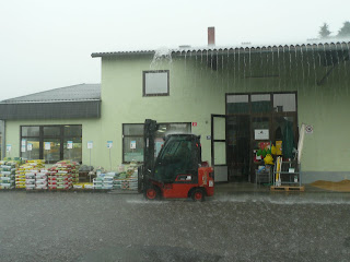 As we rode through these sunny, tidy fields, the storm clouds began to gather in some strength. As usual, we were a bit slow to react and, as the thunder and lightning moved closer we were still out in the open. Then all hell broke loose as the rain and hail hurtled earthwards. Once we were soaking wet, we finally found shelter in a petrol station. The last time we had seen a storm of this ferocity was on my first trip, and Alan’s second, to (guess where) Austria, when we were camping in a mountain tent inside another frame tent and frantically digging trenches with ice axes to direct the flood water away from the canvas. This time we were ushered into the service station by a concerned owner who was worried about the proximity of the lightning to the fuel!