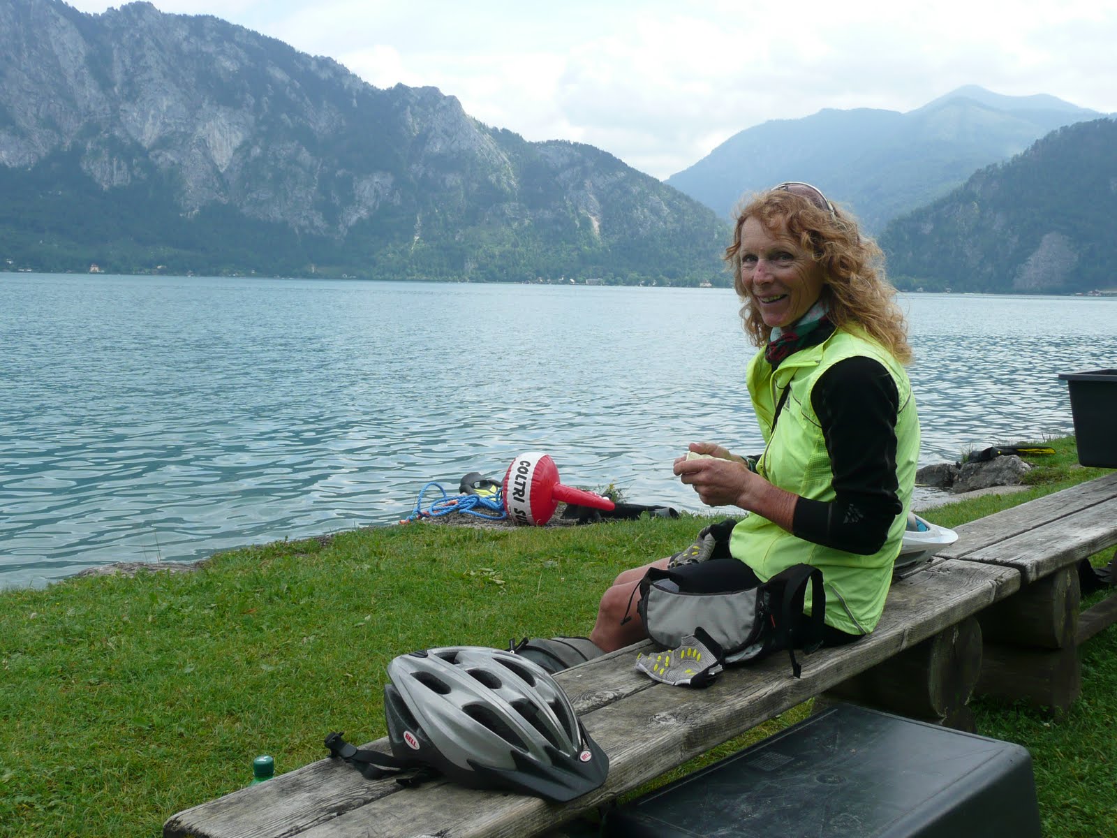 A path which led us to a countryside in direct contrast with the one we had so recently been through. In a trice, we were riding alongside an aquamarine lake surrounded by mountains, some with their peaks hidden by the clouds. This was obviously a playground for the rich; boats on the water, another millionaires’ row, Ferraris and Porches abounding. Mind you, they had to queue up behind two bikes with trailers the same as everybody else when the road narrowed, which it did frequently. Sadly much of the actual lakeside was out of bounds as every piece of land was ‘verboten’ to joe public. We did eventually find a spot which was not ‘verboten’ and sat down to enjoy our lunch. For no apparent reason, the water in front of us began to bubble and we fearing, at the very least, a deadly man eating monster, were relieved to watch several divers surface and fall around under the weight of all their clobber.